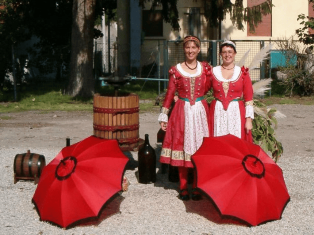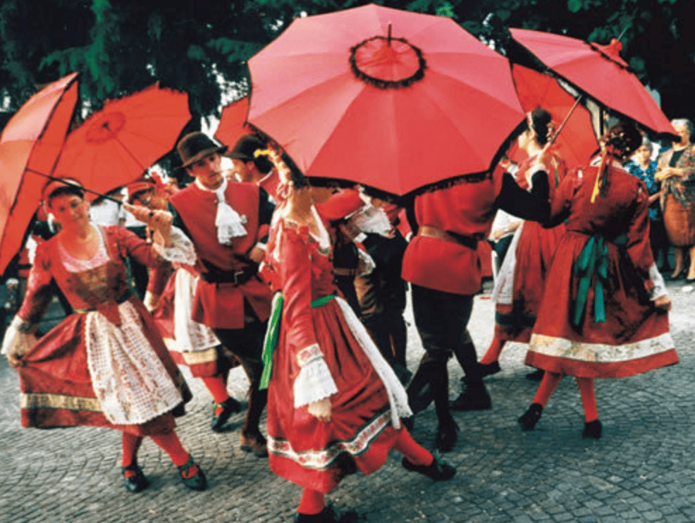 Ballo degli ombrelli: a tempo di skottisch. Le ballerine maneggiano con grazia dei parasole in seta rossa a frange nere copiati da un modello autentico di fine ‘700.